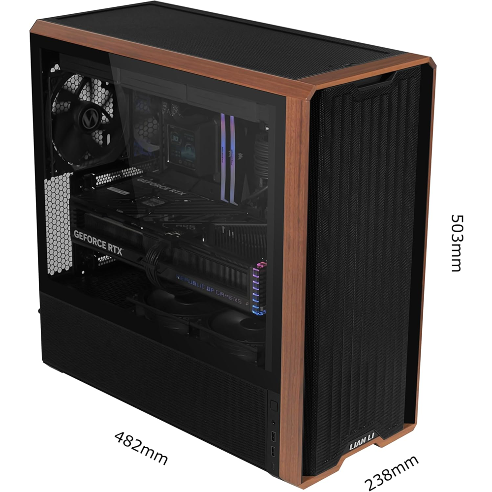 The LANCOOL 217 is thoughtfully engineered to blend natural wooden aesthetics with high-performance airflow. It features a front panel that pairs finely perforated mesh with a wooden frame to maintain an organic look while allowing for unrestricted airflow.