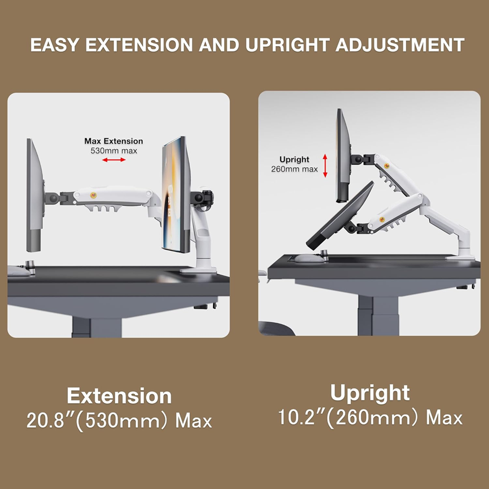 This monitor stand allows you to mount monitors from 10 to 27 inches with 75 or 100 mm VESA stand. It supports a maximum weight of up to 9 kg. Just install it and you can position your monitor as you wish: it has 360° rotation, 85° tilt and 180° swivel capability. You can also get closer or further with its multiple hinges, which can raise the screen up to 262 mm and move it away from you up to 538 mm.