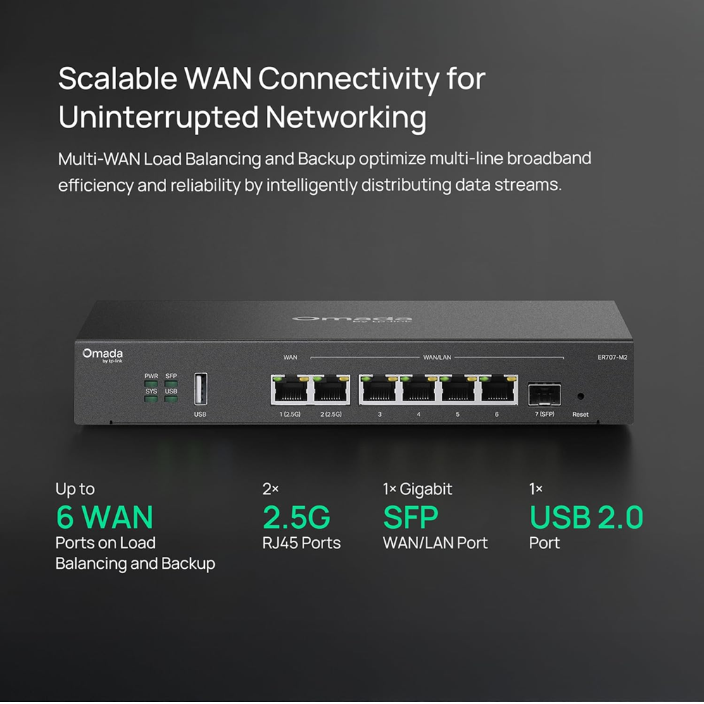 As the router that seamlessly integrates into the Omada Software Defined Networking (SDN) platform, ER707-M2 allows for remote and centralized management, anywhere, anytime. Standalone management via the Web UI or app is also available to maximize convenience.