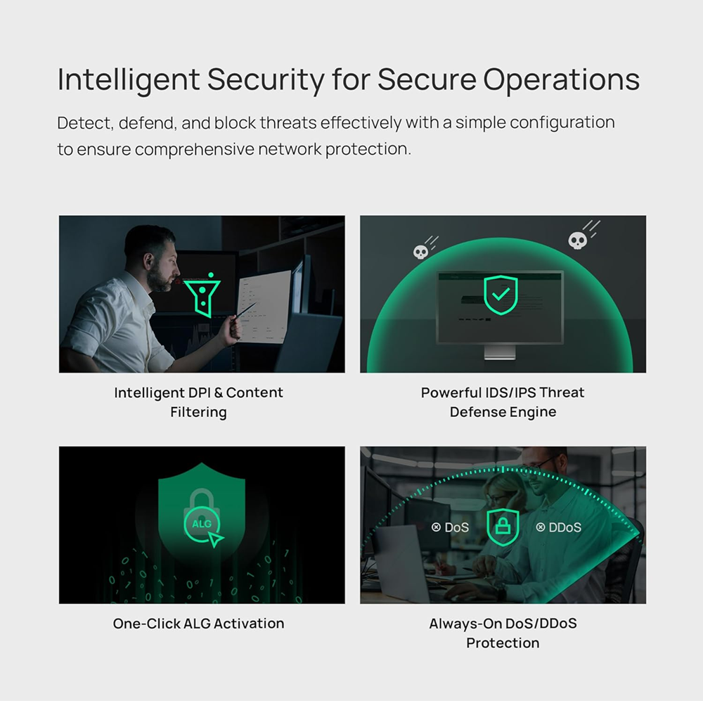 - DoS/DDoS protection, IP/MAC/URL filtering, DPI, and IPS/IDS for enhanced security
