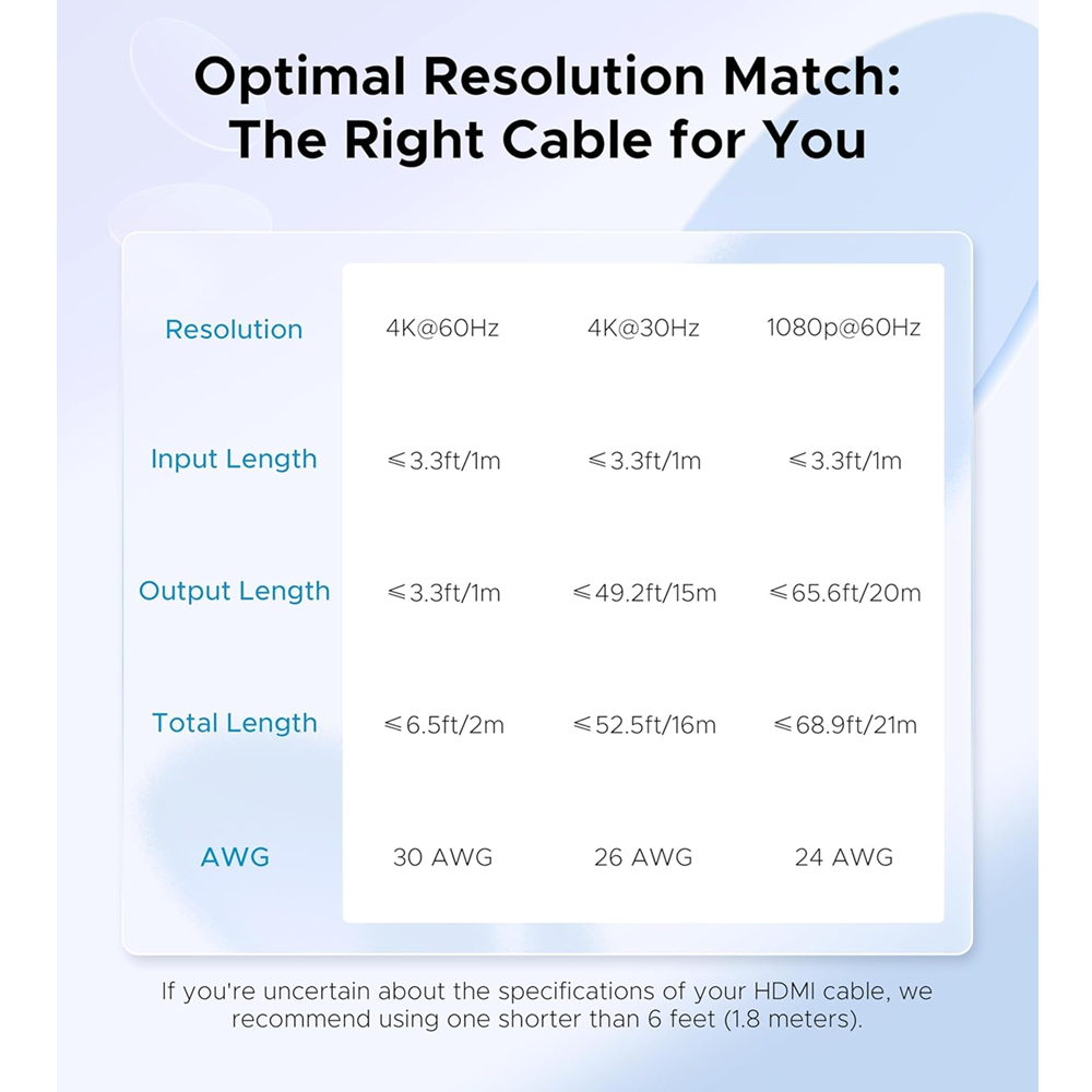 - Since long transmission distance would cause picture degradation, we recommend that the total length of HDMI cable is ≤3M if you need to get 4K@60hz video connections.